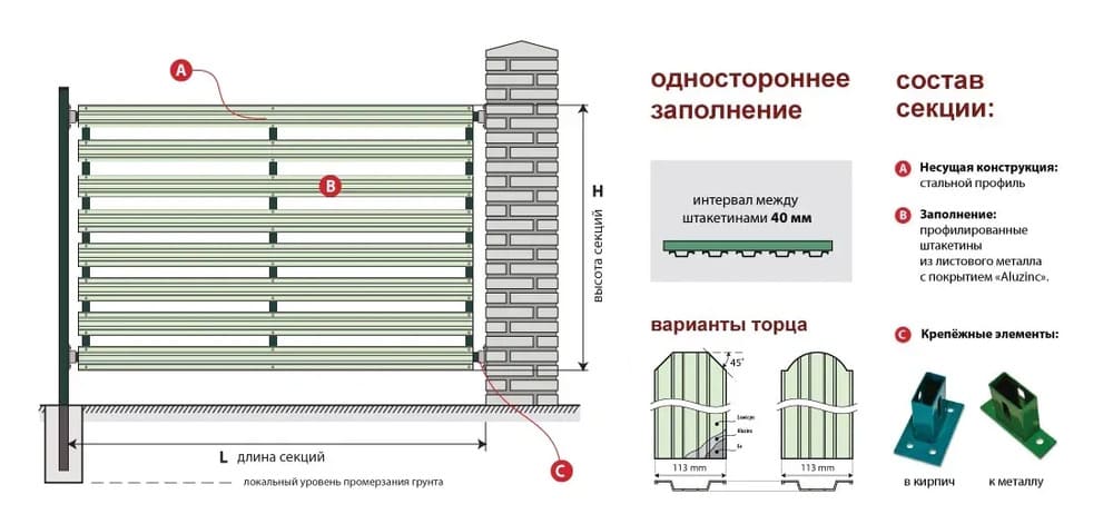 Опорные столбы – металлические трубы (40×40 мм, 60×60 мм) или профильные столбы с заглушками.