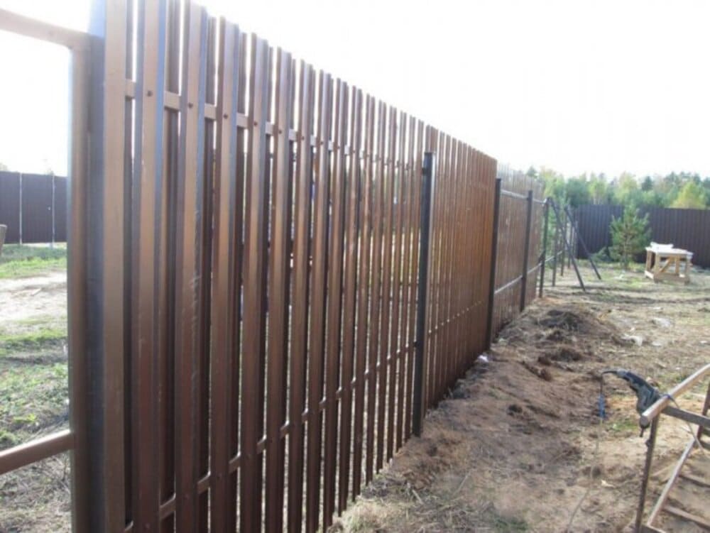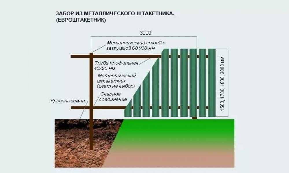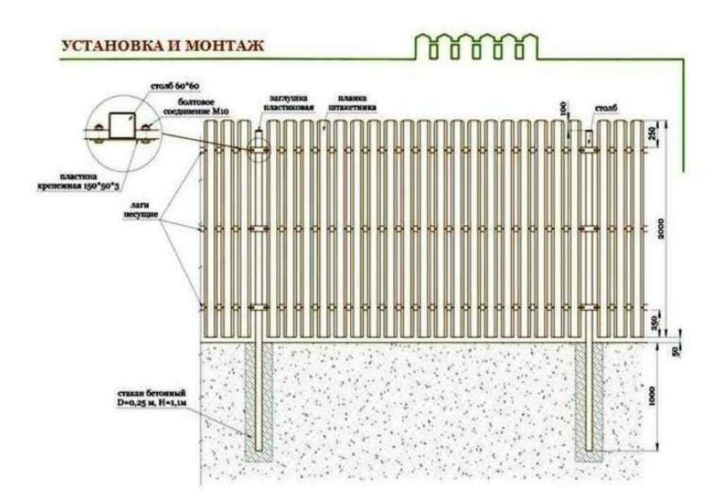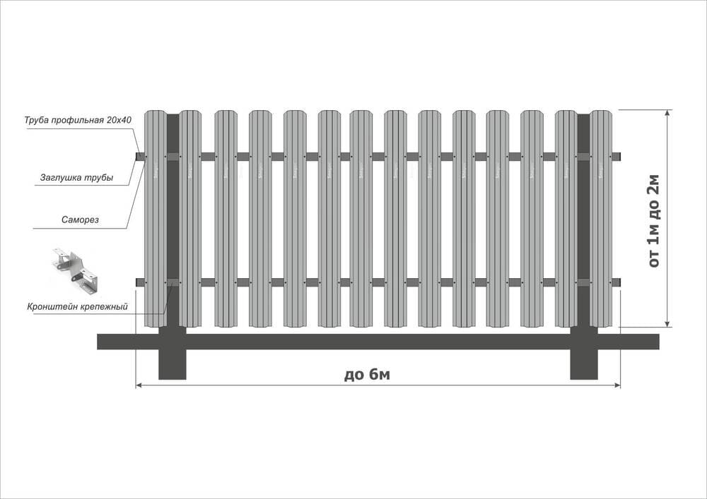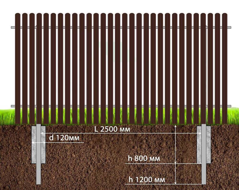 Количество столбов – расстояние между ними 2–3 м (чем тяжелее штакетник, тем чаще опоры).