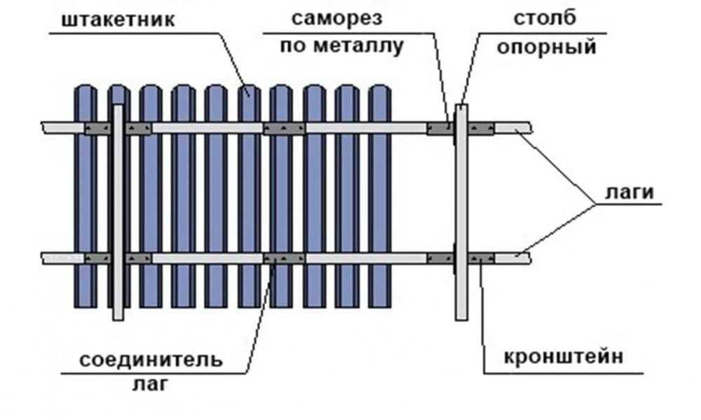 Лаги – обычно 2 ряда для забора до 1,5 м, 3 ряда – для более высоких.
