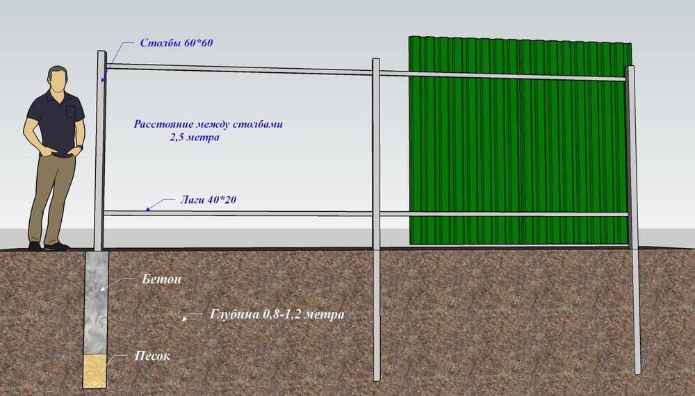 — Если забор имеет дополнительные нагрузки (например, он из сетки рабицы или оснащен навесами), следует увеличить глубину заложения столбов.