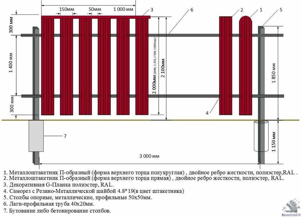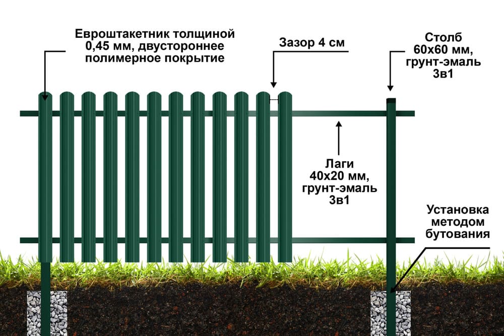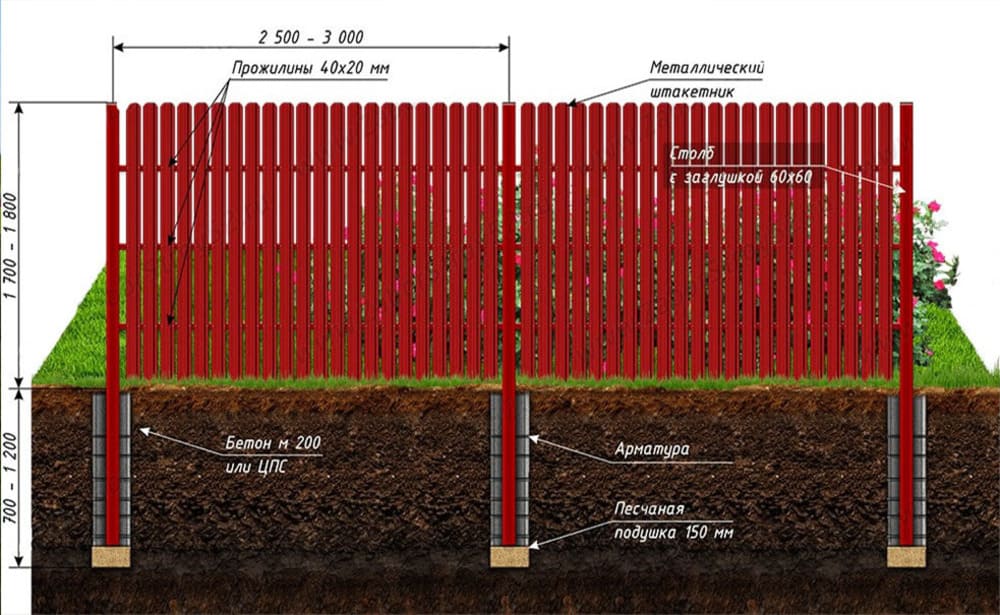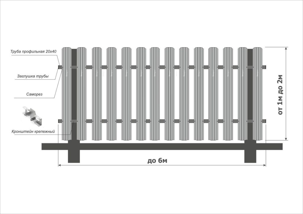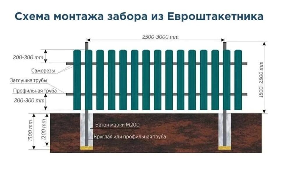 Чем выше забор, тем сильнее нагрузка на опоры. Даже если евроштакетник монтируется с зазорами, высокая конструкция имеет значительную парусность.