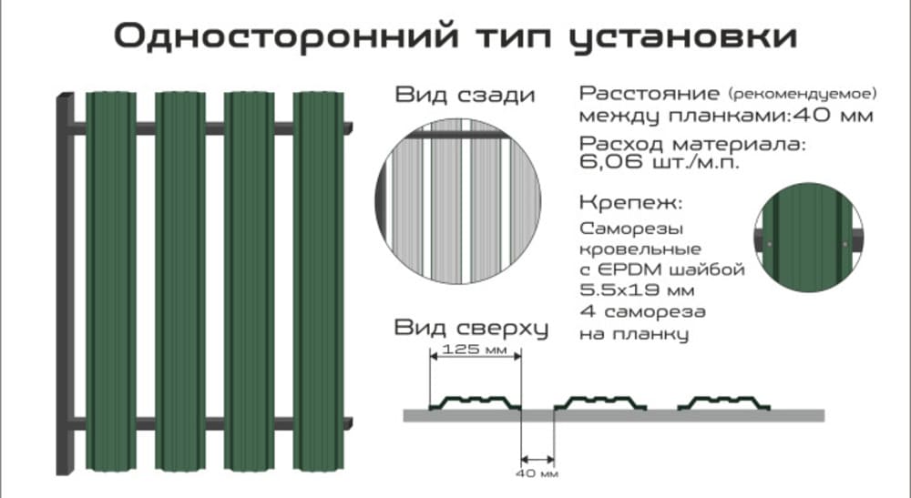 Однорядная установка — планки крепятся в одну линию, нагрузка на столбы ниже, поэтому можно оставить стандартный шаг.
