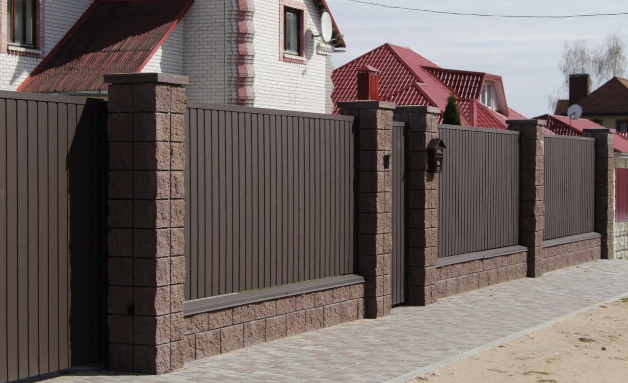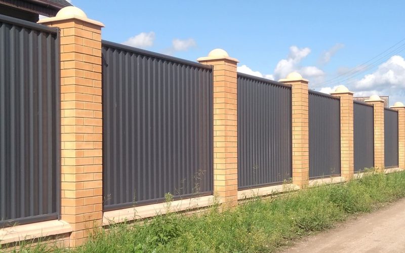 Заборы из металлопрофиля с кирпичными столбами