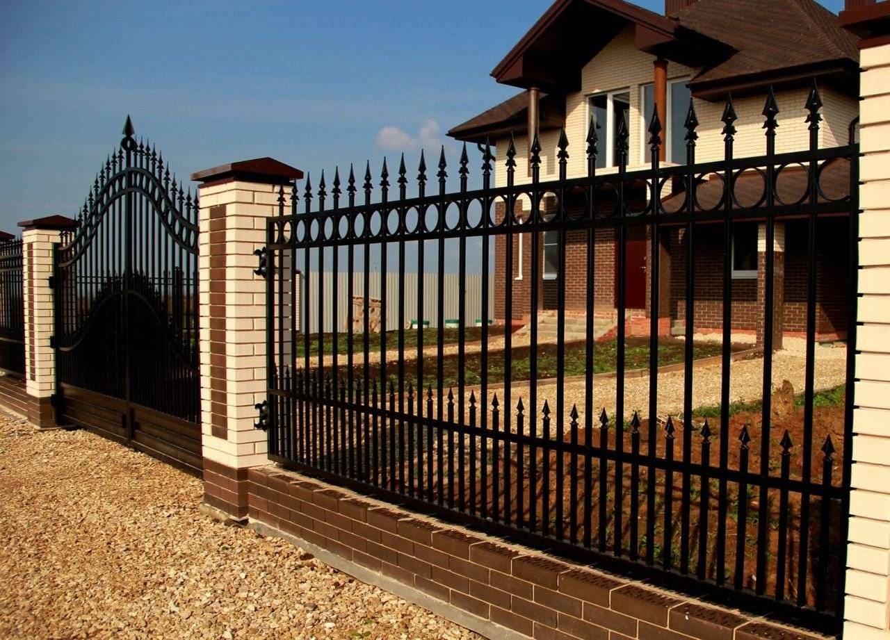 Железный забор представляет собой ограждение, которое состоит из вертикальных опор, горизонтальных лаг, пролетов. Опоры устанавливают на расстоянии 2-2,5 м друг от друга. Направляющие монтируют в два ряда на расстоянии 15-30 см от верхнего и нижнего края секции. В зависимости от типа грунта на участке опорные столбы устанавливают на сваи, бетонируют или забутовывают, строят капитальный ленточный фундамент.